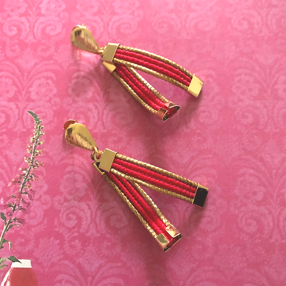 Grosser Ohrstecker aus goldenem Gras, schwarzer Baumwolle und vergoldetem Metall.